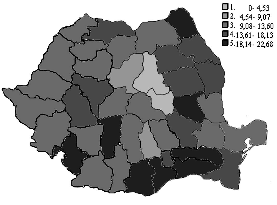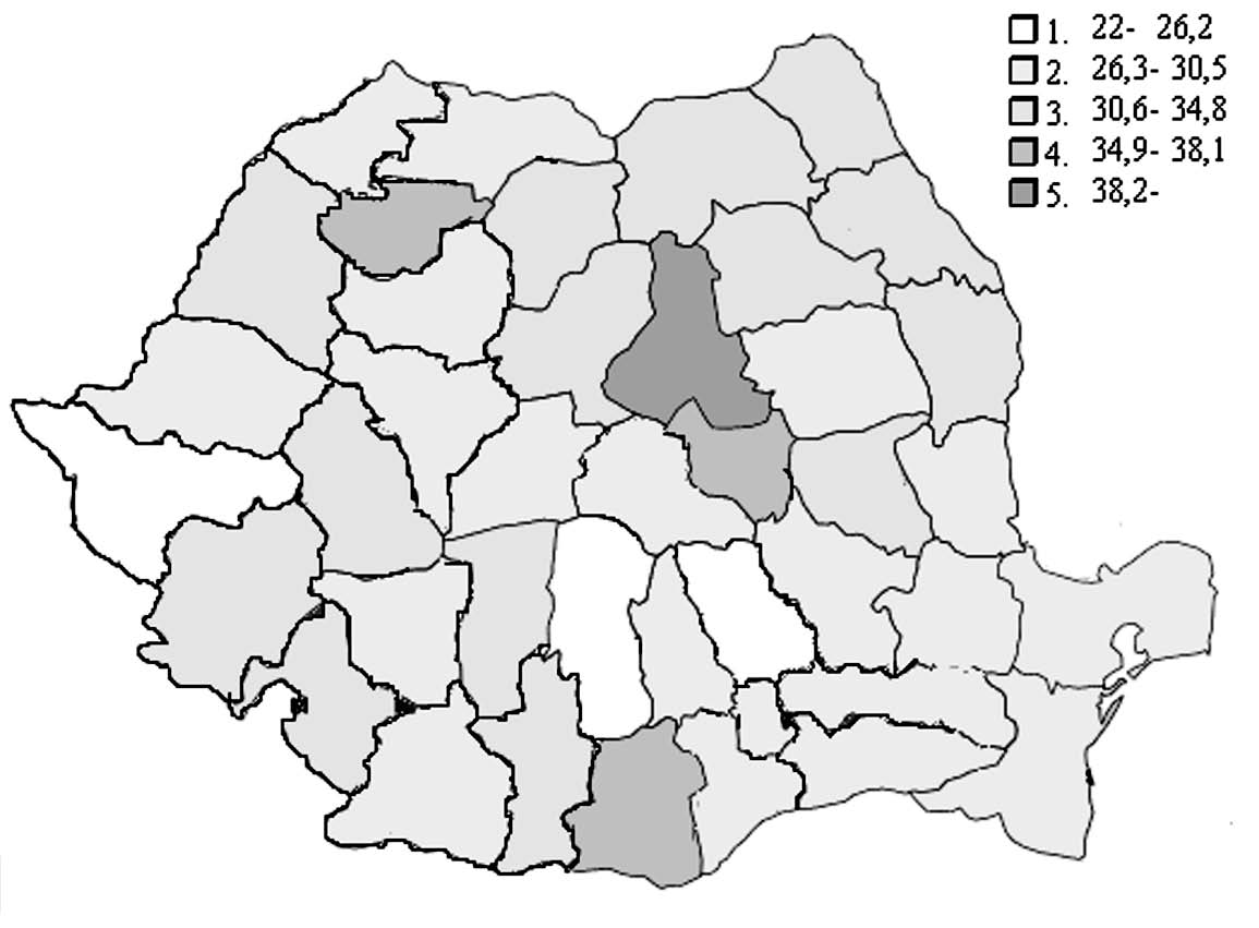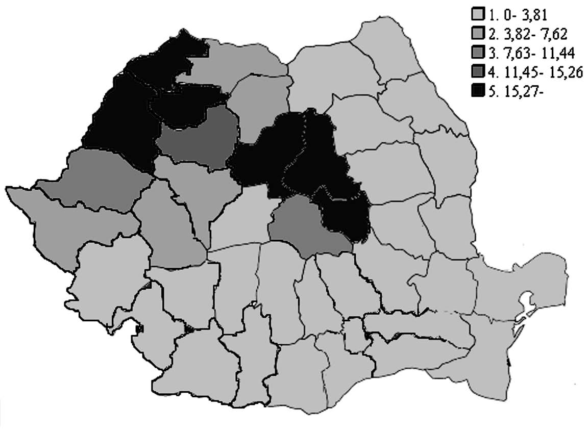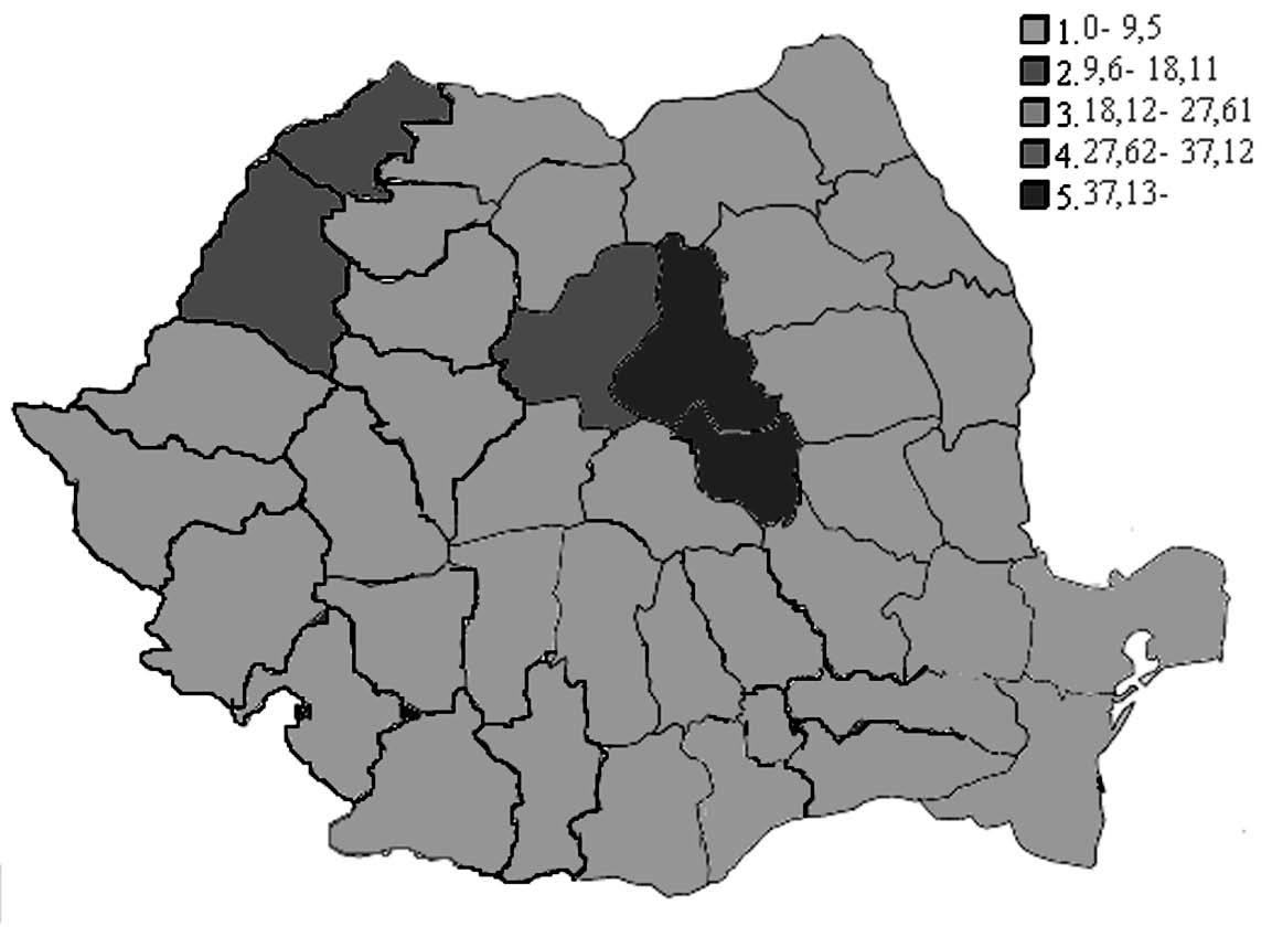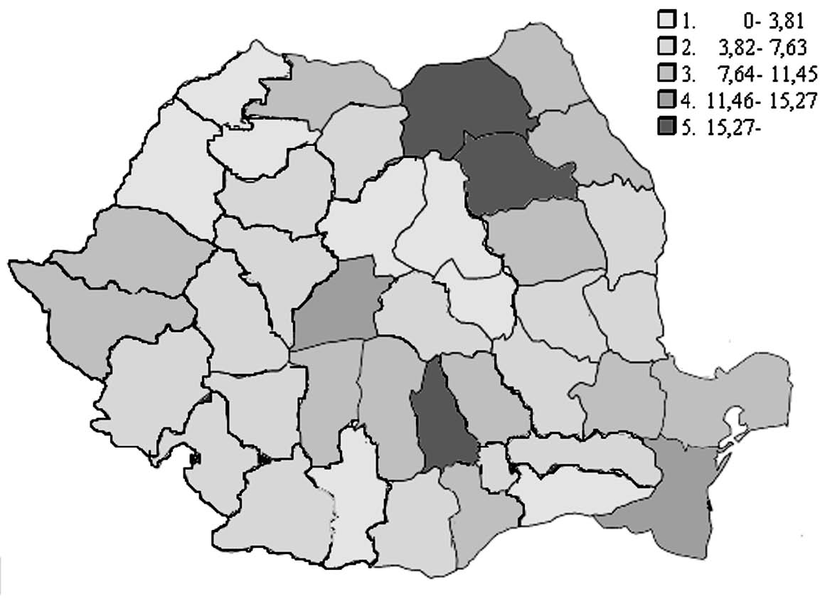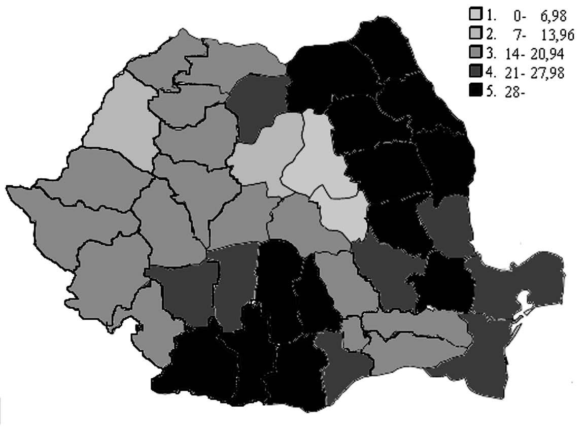 58 A Regátban megyénként átlagban 27,64%-ot ért el, de Erdélyben csak 15,77%-ot (lásd még a 7. és a 10. táblázatot).