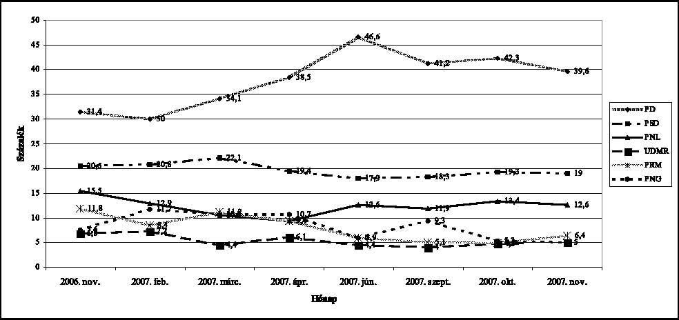 103 Gondolunk itt elsősorban arra, hogy Traian Băsescu elnök egy idő után az általa tető alá hozott kormánykoalíció szétverésén munkálkodott, majd az általa megálmodott, széles körű kompetenciákkal felruházott elnöki hivatal létrehozása érdekében erős elnöki pártot szeretett volna létrehozni. Az sem mellékes persze, hogy a PC folyamatosan támadta az RMDSZ-t. 104 A populista és egyben népszerű államelnök egyetlen számottevő sikere tulajdonképpen a hivatalából való felmentését célzó népszavazáson aratott elsöprő, de ugyanakkor talán arányaiban is várható győzelme volt.