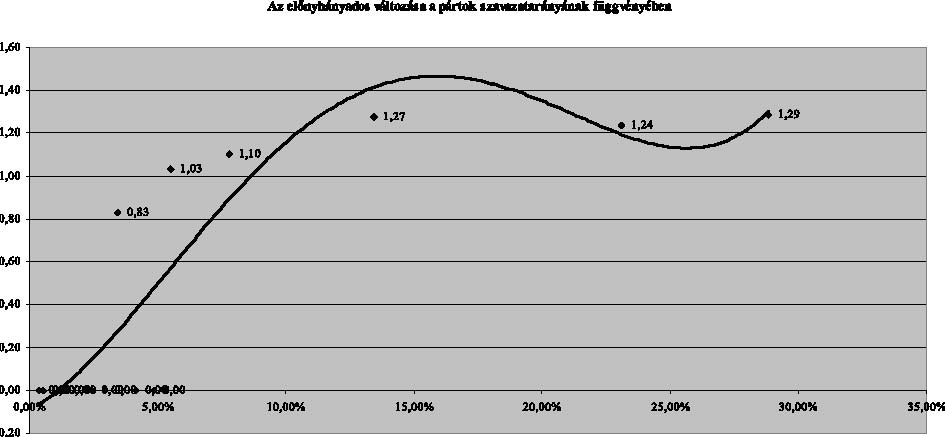 47 A statisztikai mutatók ezt egyértelműen szemléltetik. A 2007., valamint a 2000. évi választásokra vonatkozó minimumok, maximumok meg átlagok tizedes törttel kifejezve rendre: 0,0316 és 0,0066; 0,4735 és 0,1691, illetve 0,2838 és 0,0676.