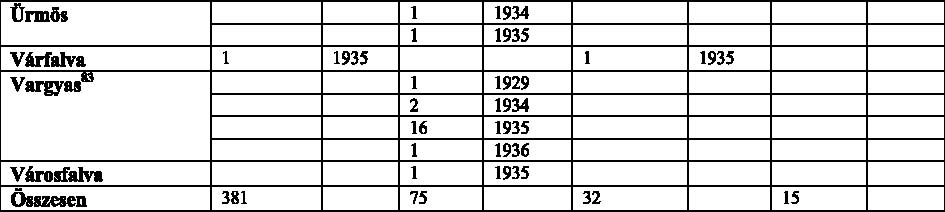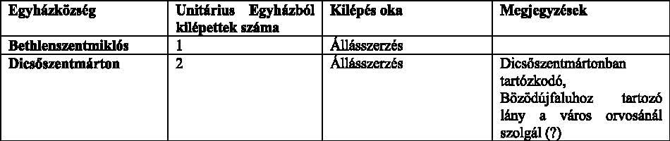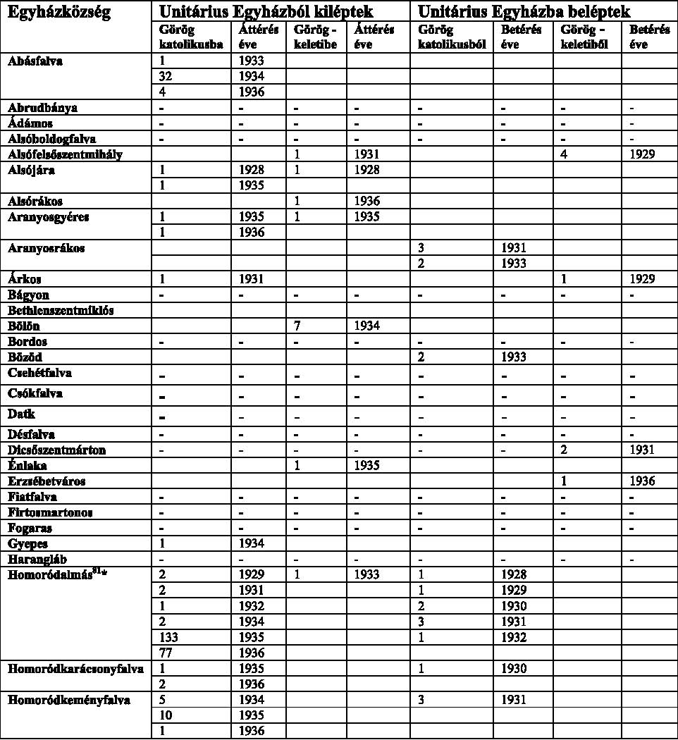 A novemberi memorandumra mindössze egy megkeresés érkezett Bukarestből, amelyben a minisztérium kimutatást kért az Unitárius Egyházban történt ki-és betérésekről, és arról, hogy az áttéréseknél a törvényes formák betartattak-e.80 Az 1936. március 31-én EKT által (minisztériumi kérésre) kibocsátott köriratra beérkezett jentések szerint 1928. április 22-től 1936 közepéig az Unitárius Egyházon belül a vallási mobilitás a következőképpen alakult.
