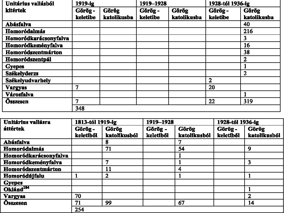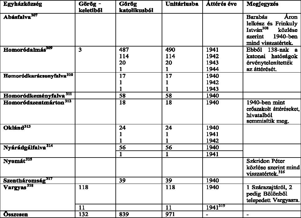Az összesítés szerint a 107 unitárius egyházközség közül 80-ból érkezett válasz az EKT köriratára, amelyek közül 37-ben (46%) jeleztek kitérést a két "román egyházba." Az erőszakkal áttértek számát azonban nem lehet megállapítani, mivel a jelentések zöme csupán a ki- és betérések számát tartalmazza. Mindössze az aranyosgyéresi jelentés jegyzi meg, hogy egyik híve állásszerzés, a másik pedig annak megtartása érdekében tért át a görög-keleti vallásra.87 Közvetlen kényszerítő okokra következtethetünk azonban azon kitértek esetében, akik állami állásokat (óvónő, jegyző, postás, adóvégrehajtó, tisztviselők, útkaparó, bírósági szolga, bába stb.) foglaltak el (pl. Siménfalva, Szentábrahám, Gyepes, Kökös, Sepsiszentgyörgy, Szentivánlaborfalva, Bölön, Homoródkeményfalva, Városfalva).88