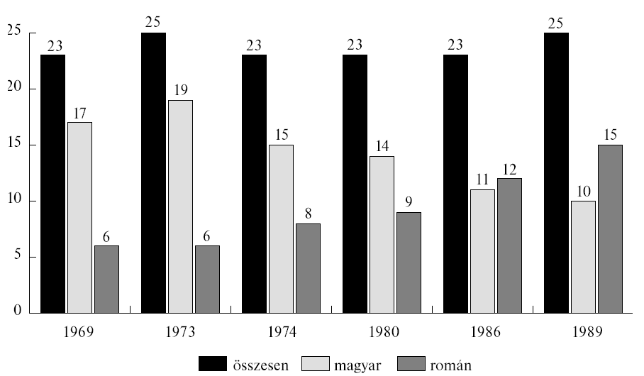 1. ábra. A Megyei Pártbüró tagjainak és póttagjainak etnikai összetétele (1969-1989)