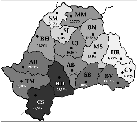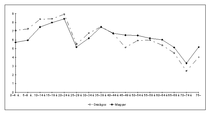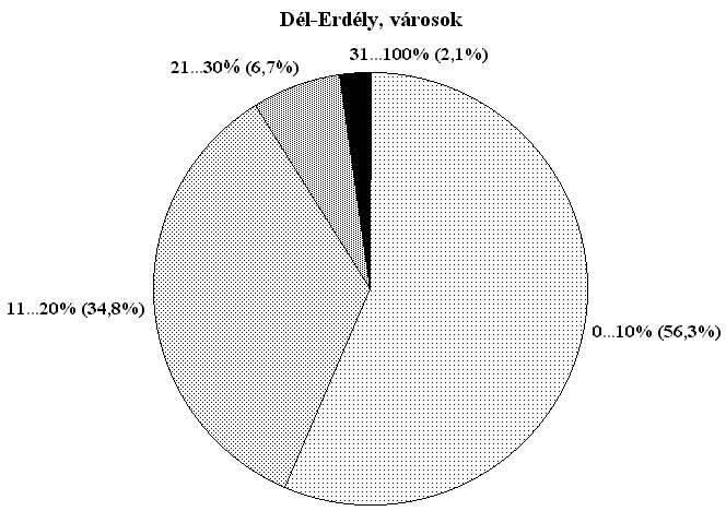 Az 1. táblázatban elsô látásra feltûnik, hogy országosan a városi magyarság jóval nagyobb mértékben fogyott, mint a falusi (17,05%, szemben a 4,88%-kal). Ennek megfelelôen az 1992-es adatokhoz képest 2002-ben hiányzó 190 582 személynek 81,78%-a a városokból hiányzik, és csak 18,22%-a a falvakból. Ez azonban nem jellegzetesen a magyar népességre jellemzô, hiszen az ország teljes népessége esetében a különbsé g még nagyobb: az 1 111 854 hiányzó 85,90%-a (955 083) hiányzik a városokból, és csak 14,10%-a (156 771) a falvakból, a román nemzetiségûek esetében pedig ezek az arányok nagyjából megegyeznek a magyarokéival: 81,72%, illetve 18,28%. A fogyás okaival ugyan késôbb foglalkozom, ezzel kapcsolatban azonban már itt megjegyzem, hogy ezeket a nagy számaránybeli különbségeket nem szabad leegyszerûsítve úgy értelmezni és kizárólag azzal magyarázni, hogy városon négyszer olyan intenzitással hatnak a népességfogyást általánosan meghatározó tényezôk, hiszen ebben az is benne van, hogy az utóbbi tíz évben volt egy bizonyos mértékû népmozgás (tulajdonképpen visszavándorlás) városról falura, tehát ami a városokból hiányzik, annak egy része a falusiak számát gyarapította, ez pedig az utóbbiak fogyásának kisebb mértékében tükrözôdik.3