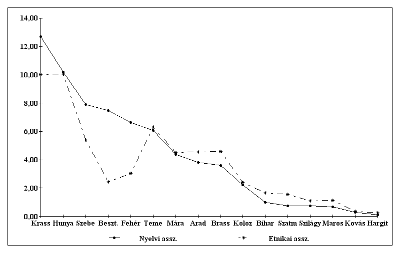 Pedig sejtésem szerint ez csak a minimális körüli szám. Mi ugyanis itt úgy számoltunk, és úgy viszonyítottuk hozzá a dél-erdélyi helyzetet, mintha Észak-Erdélyben egyáltalán nem lett volna asszimilációs fogyás. Pedig ott is volt. Ha ennek nagyságát jobban ismernénk, és azt le tudtuk volna vonni az észak-erdélyi fogyásból, s a dél-erdélyit aztán ehhez a maradékhoz viszonyítottuk volna, akkor az ott kapott számok is nagyobbak lennének valamivel. Adataink alapján azonban az 1992 utáni észak-erdélyi asszimilációs fogyásról nehezebb bármilyen becslést is kialakítani, hiszen ha itt is ugyanazt tennénk, mint az imént, vagyis ezek et a megyéket is az észak-erdélyi átlagokkal hasonítanánk össze, akkor igazából a saját átlagukhoz viszonyítanánk ôket, az átlagot meghaladó különbségben pedig még csak megbecsülni sem tudnánk, hogy mi származik az asszimilációból, mi a természetes szaporulatból, illetve mi a kivándorlásból, hiszen ezeknek megyénként is nagyon eltérô lehet a mértéke.