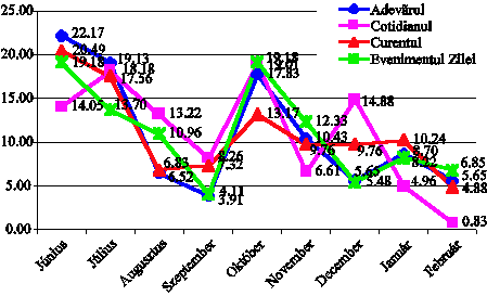 A kiválasztott napilapok: Adevarul, Cotidianul, Curentul és Evenimentul Zilei. Az Adevarul és az Evenimentul Zilei a két legnagyobb példányszámú romániai napilap 1, míg a két másik napilap kiválasztásánál az elsôdleges szempontot az Adevarultól eltérô politikai irányultság jelentette.2