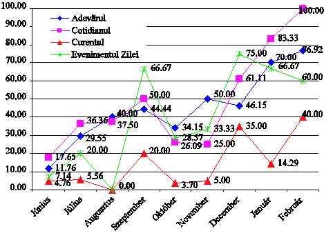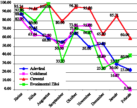 Az adatok elemzésekor az elsô szempont az esetsûrûség volt. A 2001. június és 2002. február közti idôszakban összesen 629 kedvezménytörvénnyel kapcsolatos cikk jelent meg, 230 az Adevarulban, 121 a Cotidianulban, 205 a Curentulban és 73 az Evenimentul Zileiben. A cikkek hónapok szerinti megoszlását napilaponként lásd az 1. táblázatban.