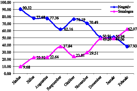 A második szempontot a cikkek szerzôi magatartás alapján történô besorolása jelentette. Eredetileg a pozitív, negatív és semleges kategóriák alapján kezdtem el vizsgálni a cikkeket, utólag indokoltnak tartottam két kategória összevonását. Mivel a kedvezménytörvényt pozitívan értékelô cikk elenyészô számban jelent meg, a pozitív és semleges kategóriát indokoltnak tartottam összevonni, és csak egy, "semleges"6 kategóriát használni.