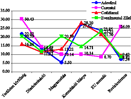 Az Adevarul hasábjain megjelent cikkek döntô hányada a kedvezménytörvény elfogadását közvetlenül követô periódusban volt besorolható valamely kulcsszó szerint - ez minden napilap esetén megfigyelhetô az adott újsághoz tartozó "b" táblázatból. Az Adevarul esetén a vizsgált periódus kezdetén a cikkek döntô hányada a konzultáció hiányát és a törvénynek az Európai Uniós normákkal való összeférhetetlenségét hangsúlyozza, mindkét téma lekerül a napirendrôl a Velencei Bizottság jelentésének közzétételével. A Velencei Bizottság jelentésével túlsúlyba kerül a hírszerû, általam nem besorolt cikkek száma.